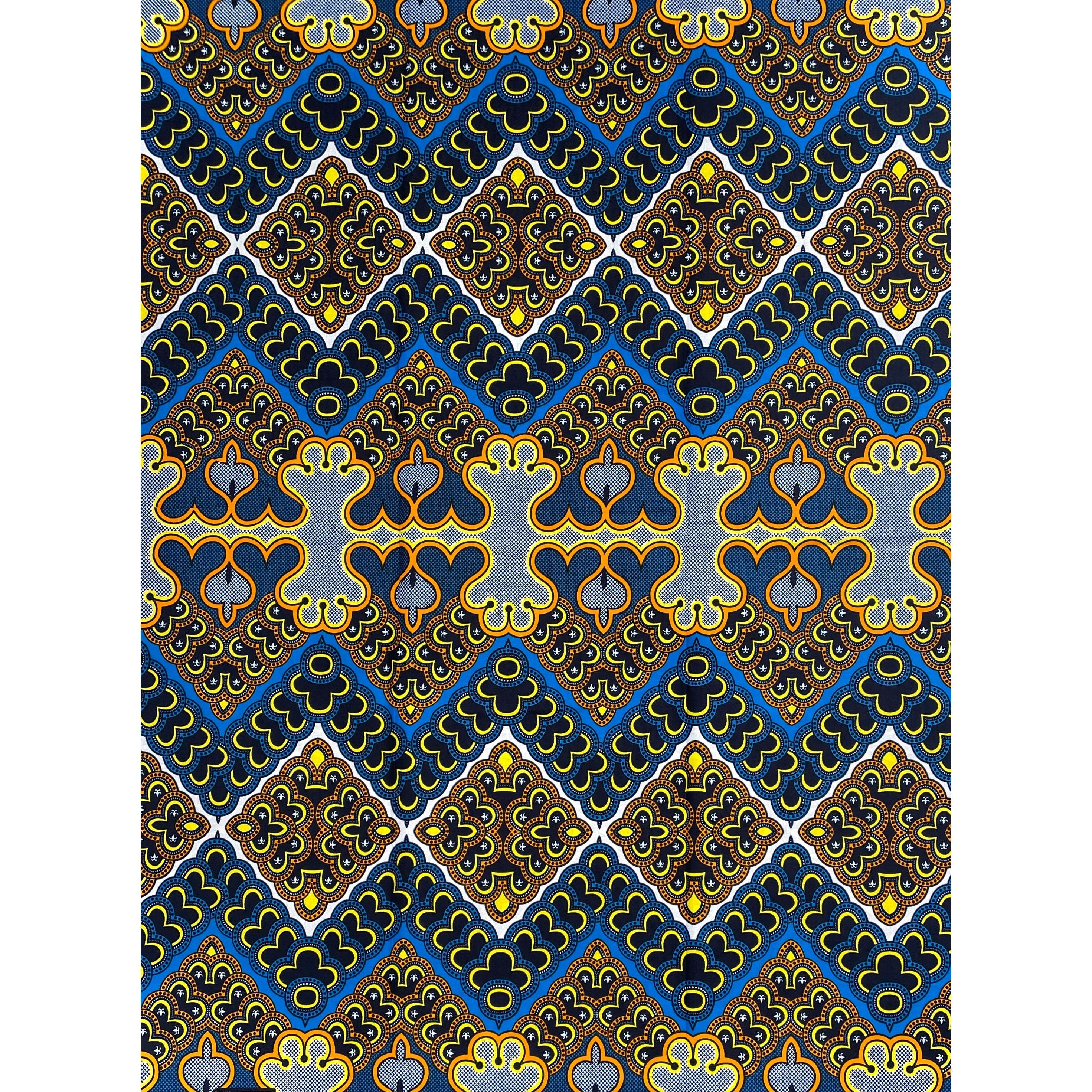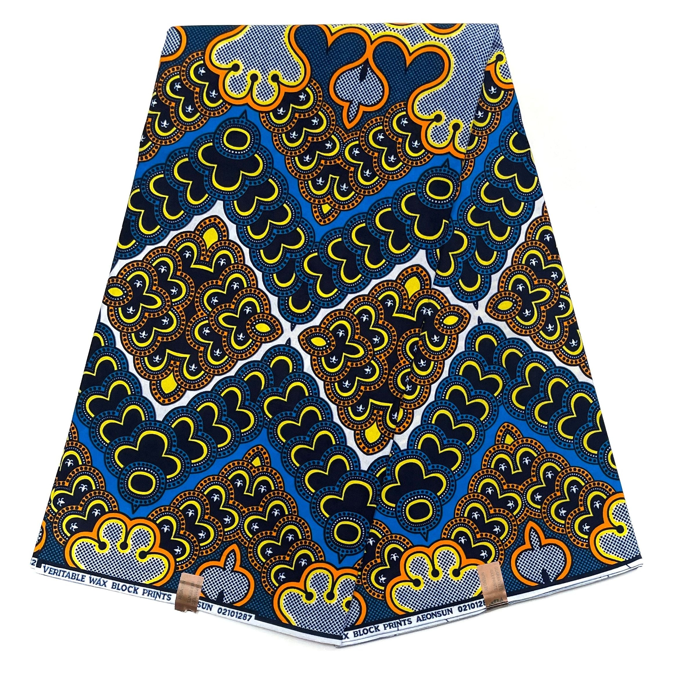 African Wax Print - 6 Yards 100% Cotton Fabric - BLUE / YELLOW / ORANGE