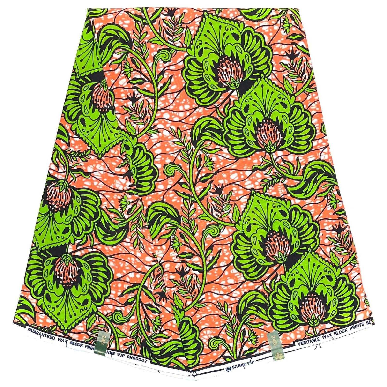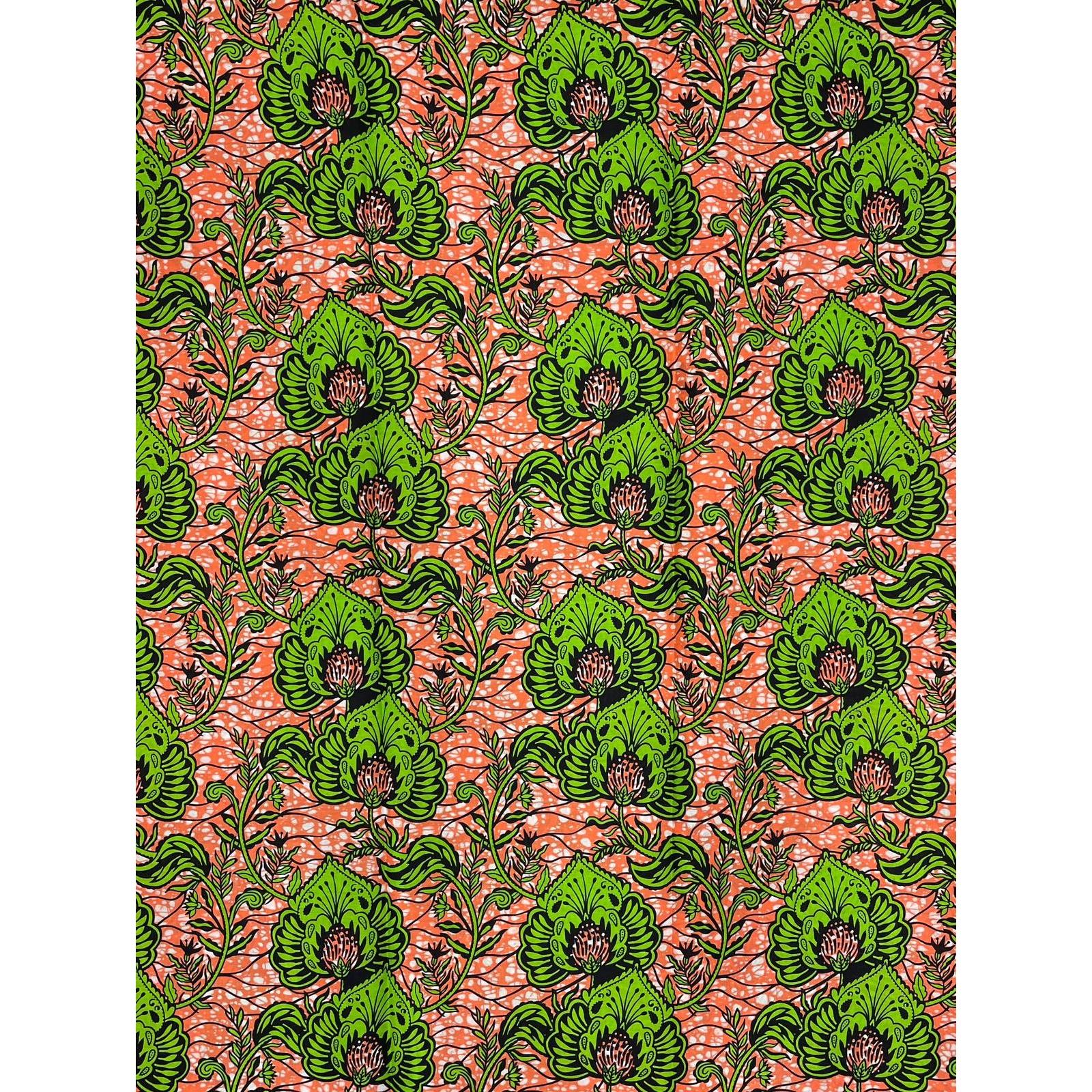 African Wax Pagne - 6 Yards 100% Cotton Fabric - SALMON / GREEN