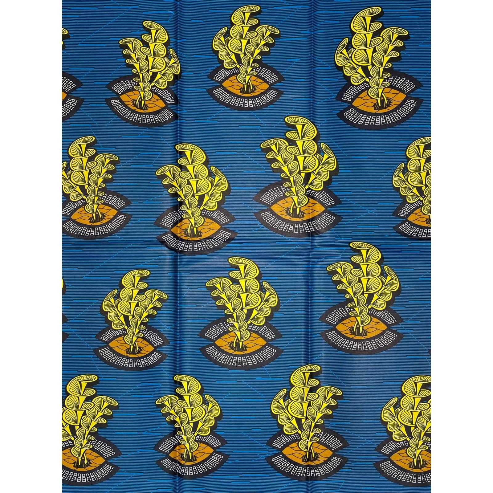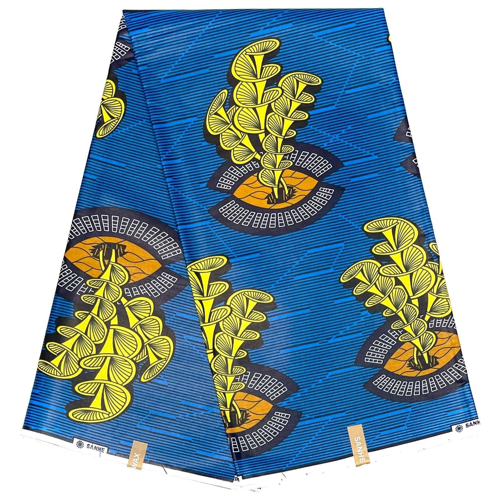 African Wax Pagne - Satin Fabric 6 Yards 100% Cotton - BLUE / YELLOW